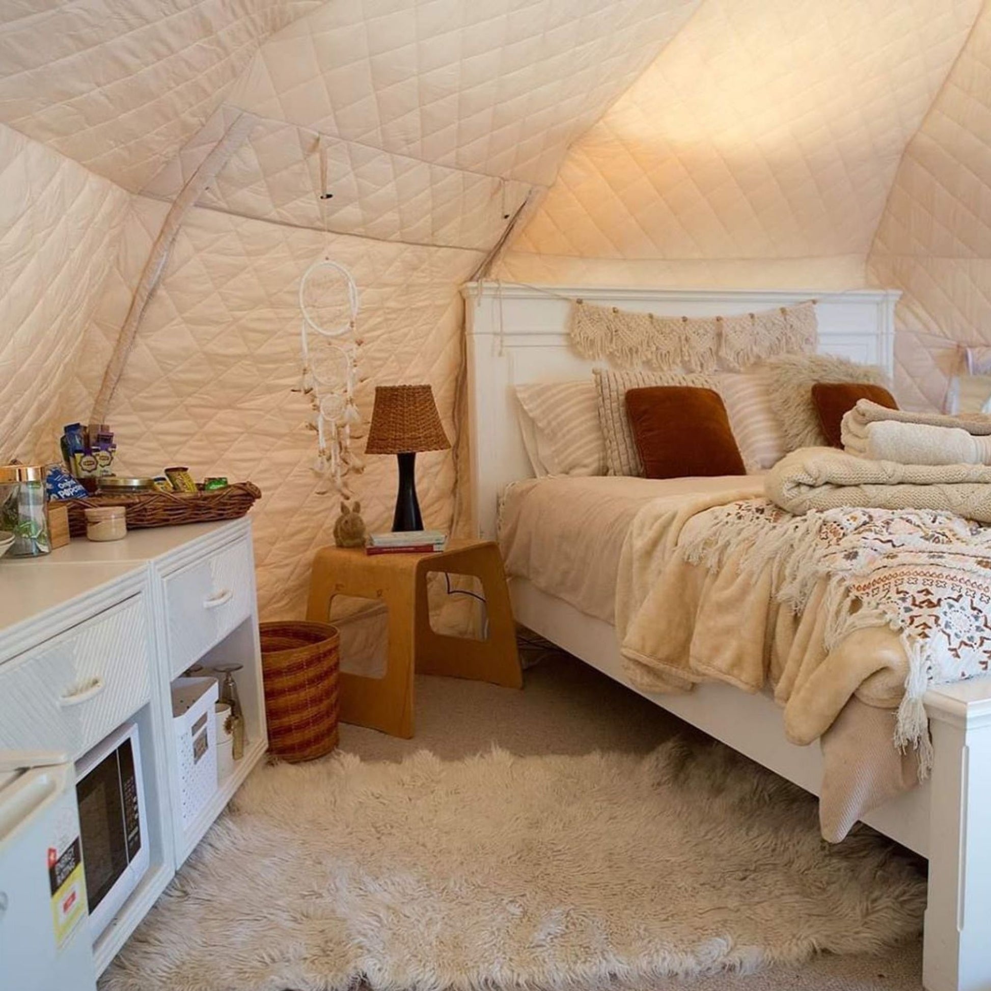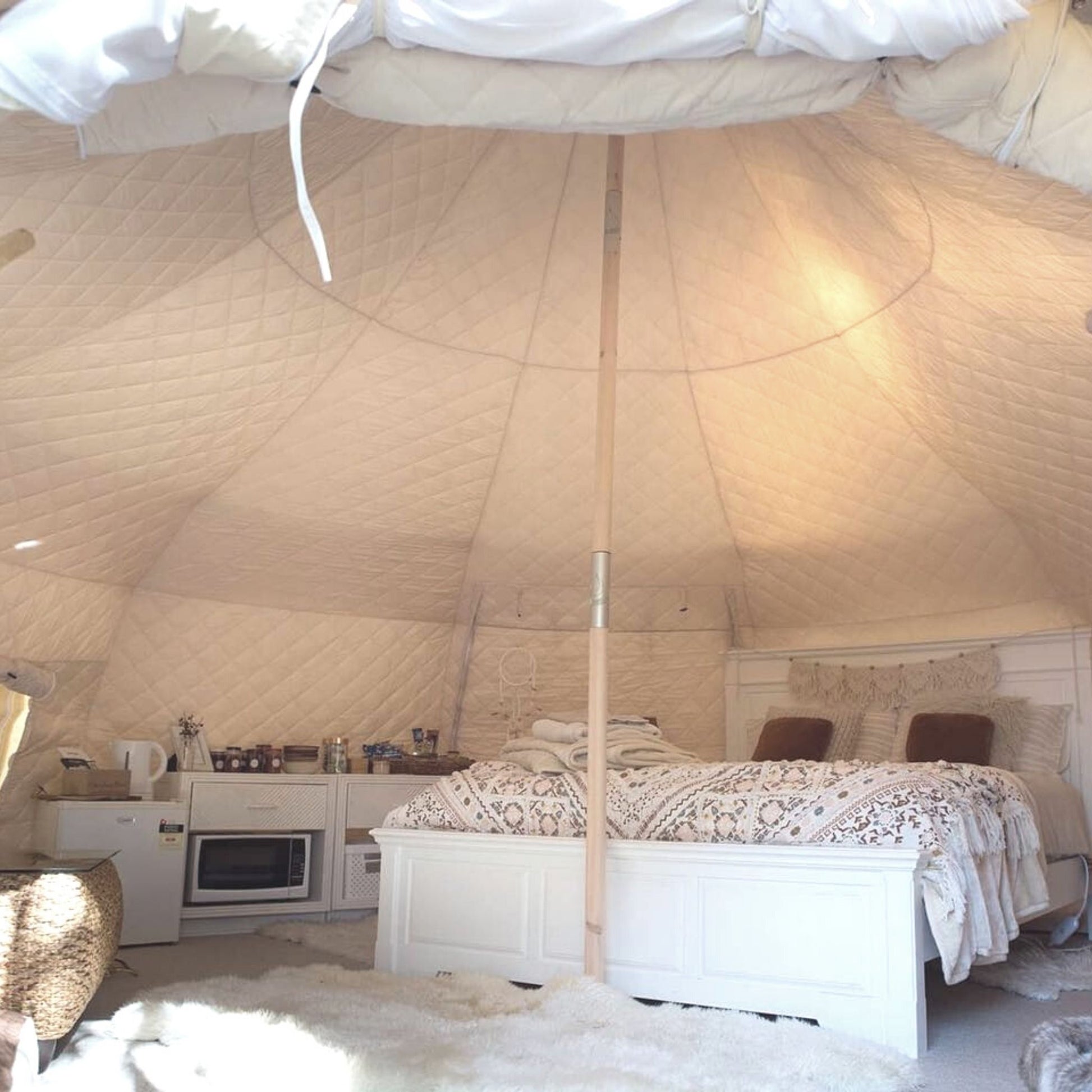 Insulated liners are essential for camping in colder climates, they are made from a thick quilted polyester that traps heat, like wearing a duvet inside your tent. This also makes them good for cooling! They fit over the center pole and clip around the wall poles hugging the interior shape.